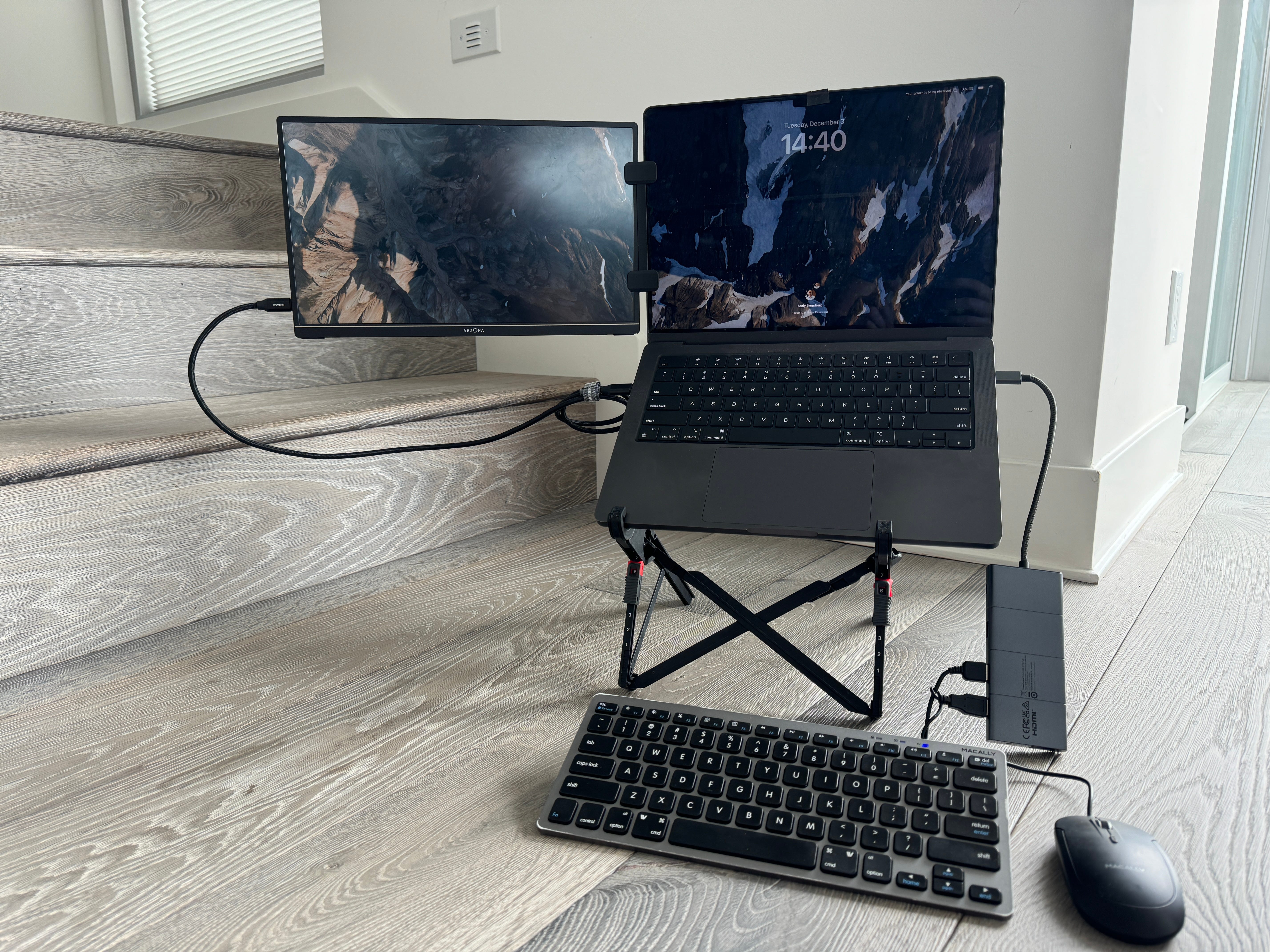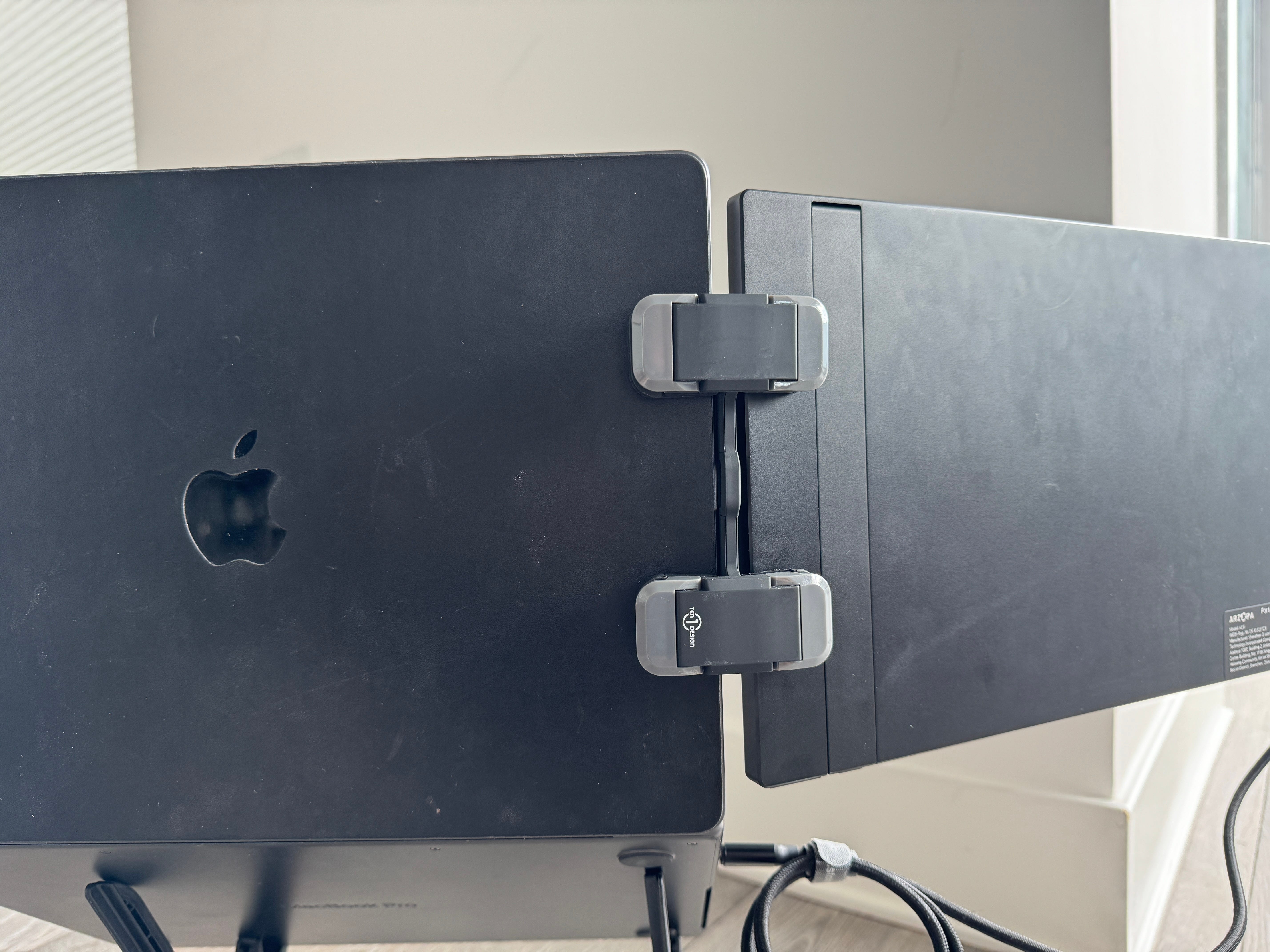 Product: the Ten One Mountie+ plus a generic portable monitor like this ARZOPA one is the best solution I’ve found for a two-monitor travel setup. I put my computer on the Roost laptop stand, attach the monitor with the Mountie+, and plug in a USB hub with a keyboard and mouse attached. The whole kit fits in a small laptop sleeve, so it’s easy to carry it around during the day while traveling.